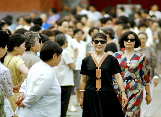 1993年5月,北京市景山公園南門,老年時裝隊表演時裝秀。人們穿衣告別保暖禦寒向美觀舒適轉變,居民穿着更加註重服裝的質地、款式和色彩的搭配。