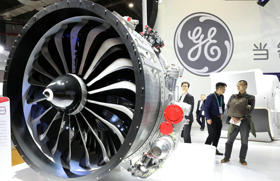 參觀者在美國通用電氣公司生產的飛機發動機模型旁駐足。
