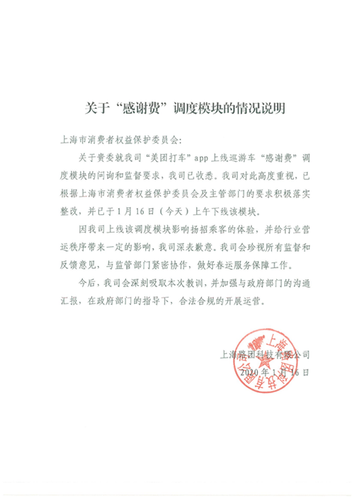 1月16日晚,美團打車(上海路團科技有限公司)回函表示,已根據上海市消保委及主管部門要求積極落實整改,並已於1月16日上午下線該模塊,因上線該調度模塊影響揚招乘客的體驗,並給行業營運秩序帶來一定的影響,深表歉意。