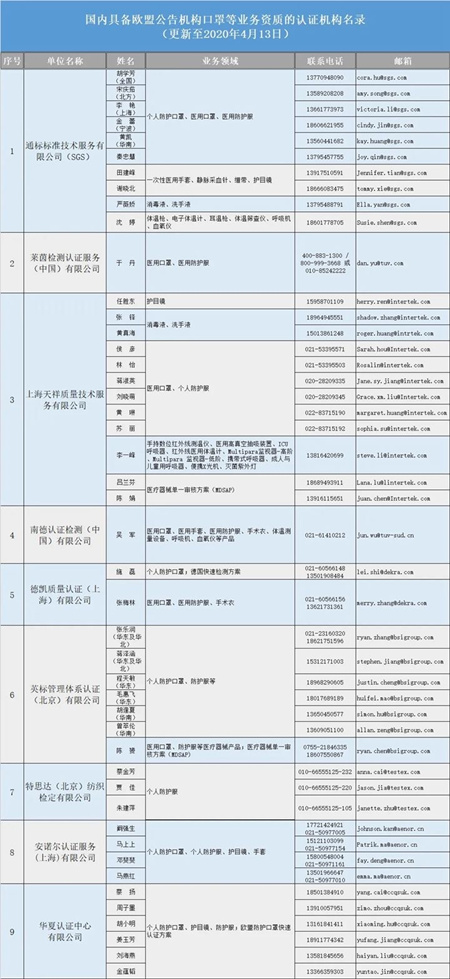 據介紹,截至2020年4月13日,我國國內具備歐盟公告機構資質可以開展口罩等產品認證業務的認證機構有9家,包括通標標準技術服務有限公司、萊茵檢測認證服務(中國)有限公司、上海天祥質量技術服務有限公司、南德認證檢測(中國)有限公司、德凱質量認證(上海)有限公司、英標管理體系認證(北京)有限公司、特思達(北京)紡織檢定有限公司、安諾爾認證服務(上海)有限公司、華夏認證中心有限公司等。
