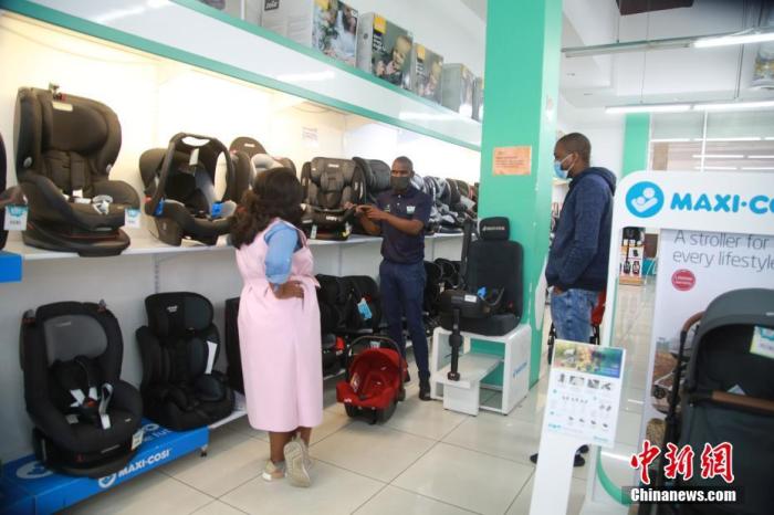 - 5月1日,南非正式將針對新冠肺炎疫情的封鎖等級由最嚴厲的第五級調低至第四級,這意味着部分商業店鋪得以重新開門,民眾也可以有限外出活動。圖為約翰內斯堡一商店內,店員和顧客佩戴口罩交流。中新社記者 王曦 攝
