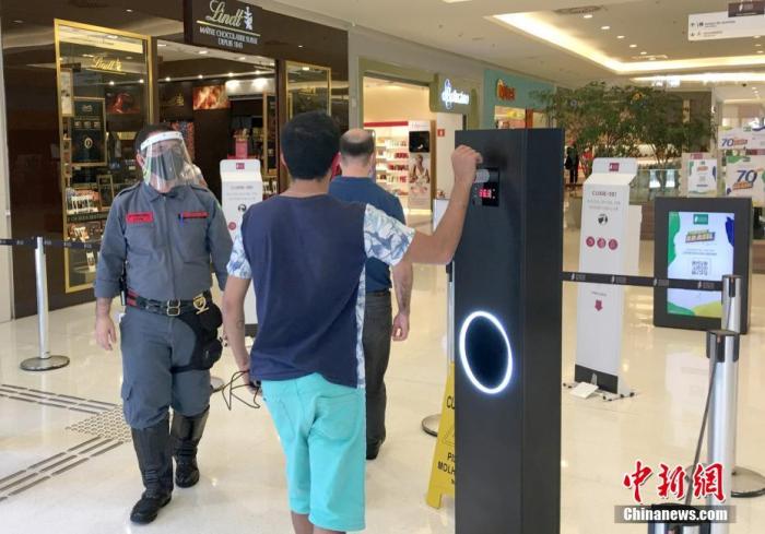 - 巴西聖保羅一家購物中心在入口處設置了自動測溫儀器。中新社記者 莫成雄 攝