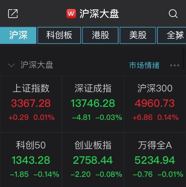 中新經緯客戶端12月17日電 17日(周四),A股開盤漲跌不一,滬指報3367.28點,漲幅0.01%;深成指報13746.28點,跌幅0.03%;創業板指報2758.44點,跌幅0.08%;上證50指數3497.39點,漲幅0.34%;滬深300報4960.73點,漲幅0.14%。